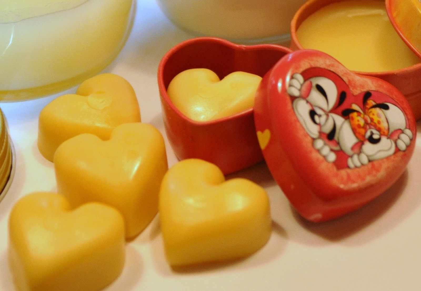 Itselläni sattui olemaan tuollainen sydämenmuotoinen metallirasia tuoksulle, aiemmasta postauksesta käy ilmi että löysin sen Paperikuusta. Samanlaisia löytynee varmasti myös Tiimarista ja muista vastaavista liikkeistä lastentarvikeosastolta. Voidetuoksun voi toki tehdä myös suoraan purkkiin. Olen myös miettinyt, toimisiko valmiille palalle säilytysrasiana jopa paksusta pahvista tehty rasia.